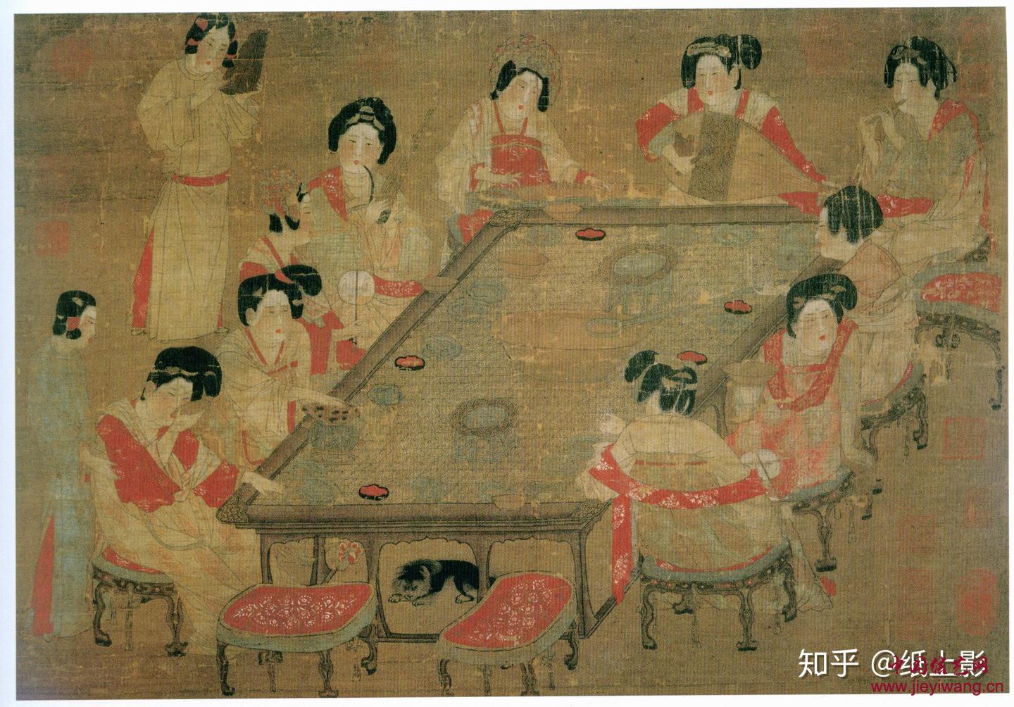 - 《唐人宫乐图》(又称《宫乐图》)是现存为数不多的晚唐写实仕女画真迹,绢本设色,现藏于台北故宫博物院。画作以工笔写实手法,完整记录了唐代宫廷仕女宴饮奏乐的生活场景.这组椅子上的绳结......