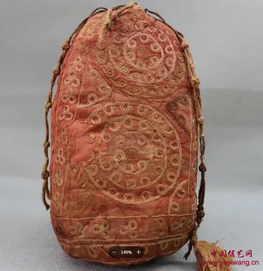 - 唐代红地刺绣圆珠纹绫袋中的纽扣结
